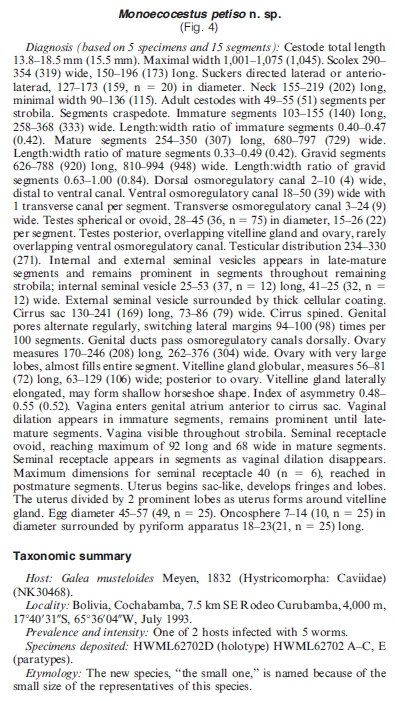 Haverkost, T. R. and Gardner, S. L. 2010. New species in the genus Monoecocestus (Cestoda: Anoplocephalidae) from Neotropical rodents (Caviidae and Sigmodontinae). Journal of Parasitology 96: 580-595. (4752) Download PDF |