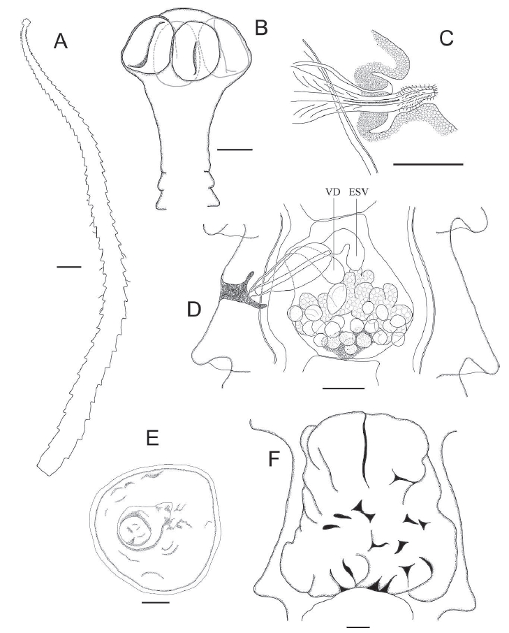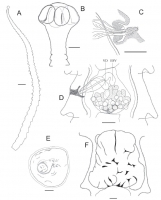 vesicle. (E) Egg. (F) Gravid segment. Scale bar for (A) 5 1 mm. Scale bars for (B), (C), (D), and (F) 5 0.1 mm. Scale bar for (E) 5 0.01 mm.