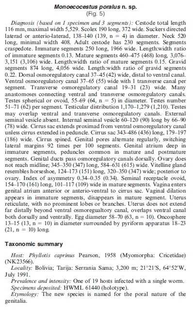 Haverkost, T. R. and Gardner, S. L. 2010. New species in the genus Monoecocestus (Cestoda: Anoplocephalidae) from Neotropical rodents (Caviidae and Sigmodontinae). Journal of Parasitology 96: 580-595. (4752) Download PDF |