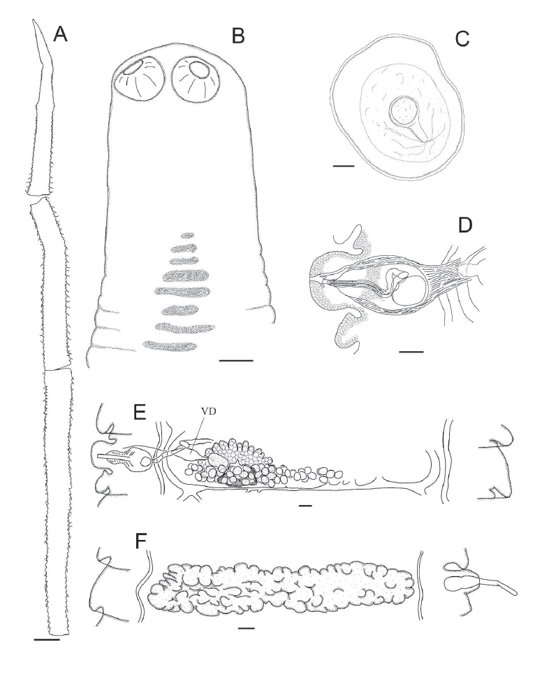 FIGURE 5. Monoecocestus poralus n. sp. (A) Strobila. (B) Scolex. (C) Egg. (D) Genitalia. (E) Mature segment. VD 5 vaginal dilation. (F) Gravid