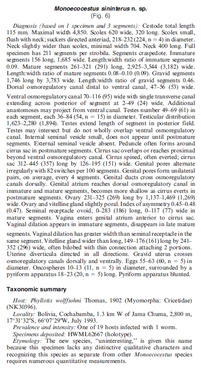 Haverkost, T. R. and Gardner, S. L. 2010. New species in the genus Monoecocestus (Cestoda: Anoplocephalidae) from Neotropical rodents (Caviidae and Sigmodontinae). Journal of Parasitology 96: 580-595. (4752) Download PDF |