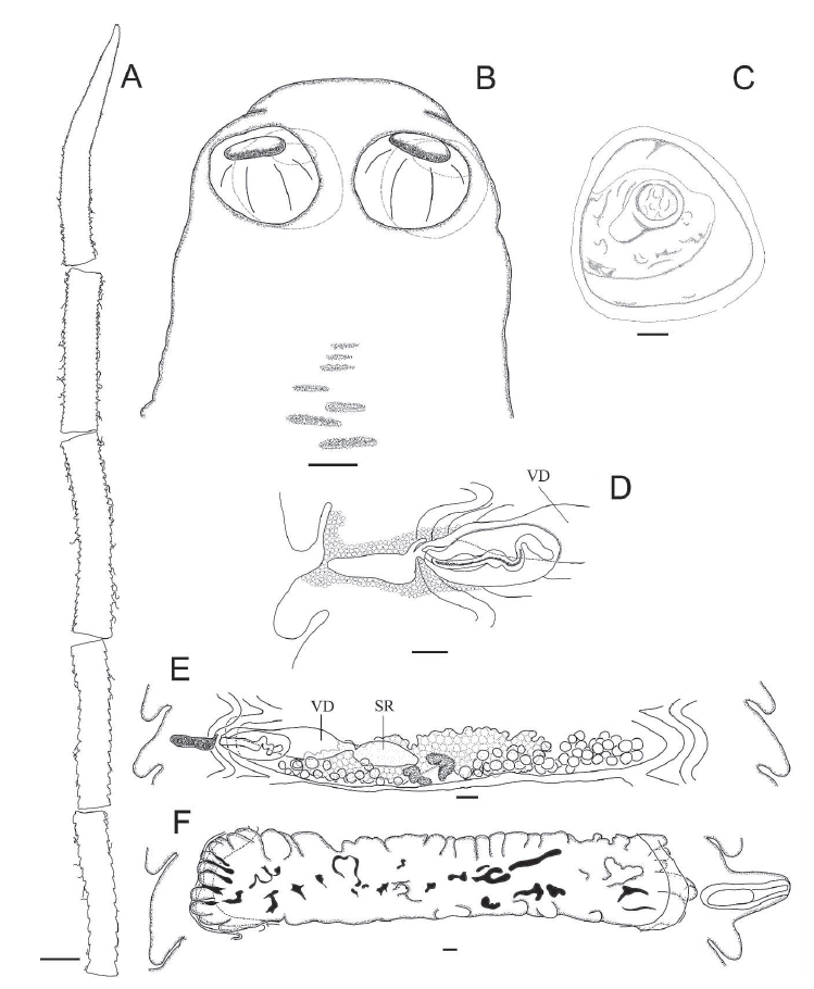 FIGURE 6. Monoecocestus sininterus n. sp. (A) Strobila. (B) Scolex. (C) Egg. (D) Genitalia. VD 5 vaginal dilation. (E) Mature segment. SR 5 seminal receptacle. (F) Gravid segment. Scale bar for (A) 5 5 mm. Scale bars for (B), (D), (E), and (F) 5 0.1 mm. Scale bar for (C) 5 0.01 mm.