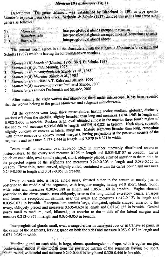 Shelke, V. P. and G. B. Shinde. 2004. Moniezia (Blanchariezia) aishvaryae n. sp. from Bos indicus (ox) at Padegaon, Maharashtra, India. Uttar Pradesh Journal of Zoology 24: 281-284.