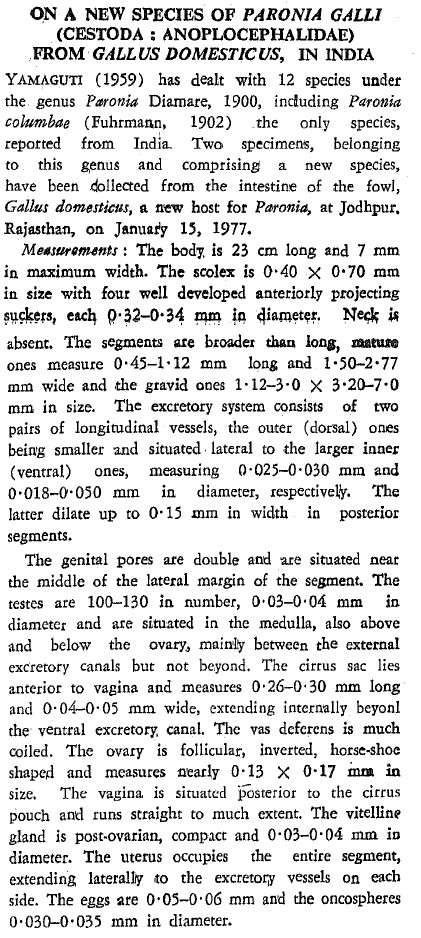 Nama, H. S. 1978. On a new species of Paronia galli (Cestoda: Anoplocephalidae) from Gallus domesticus, in India. Current Science 47: 352-353. (5572) Download PDF |