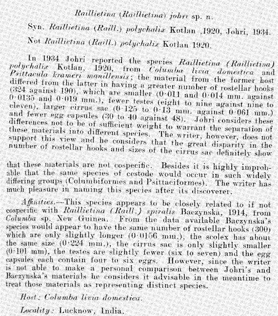 | Synonyms | Raillietina (Raillietina) polychalix (Kotlan, 1920) Johri, 1934, after R. (R.) polychalix Kotlan, 1921 |