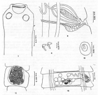 Figs. 7-12. Raillietina (R.) johri ortlepp, 1938 from a pink-necked green pigeon in Palawan. 7. Scolex and neck; 8. Rostellar hooks; 9. Terminalia; 10. Mature proglottid; 11. Gravid proglottid; 12. Egg.