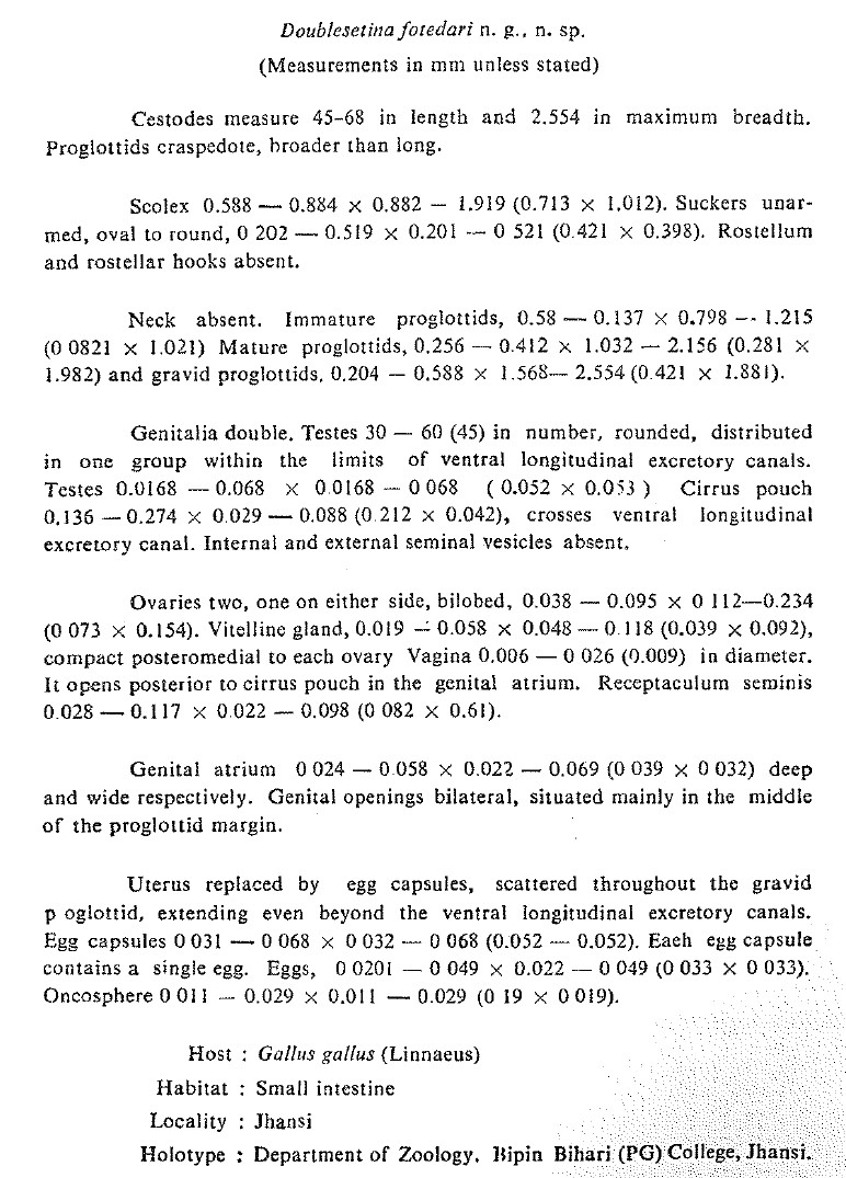 Srivastava, B. K. and A. K. Srivastav. 1989. First record of a new tapeworm, Doublesetina fotedari n. g. from domestic fowl, Gallus gallus, Linnaeus. Uttar Pradesh Journal of Zoology 9: 25-28. (5661) Download PDF |