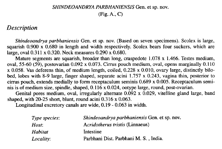 Shinde, G. B., M. A. Mahajan, P. A. Mahajan, and I. J. Begum. 1999. Shindeoandrya parbhaniensis gen. nov. Cestoda: Anoplocephalidae Blanchard, 1891 from a bird in M.S., India. Rivista di Parassitologia 16: 123-126. (5677) Download PDF |