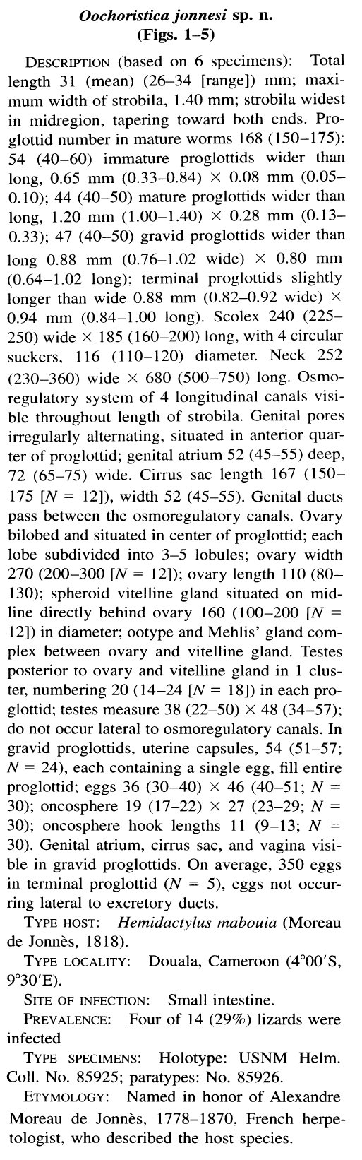 Bursey, C. R., C. T. McAllister, and P. S. Freed. 1977. Oochoristica jonnesi sp. n. (Cyclophyllidea: Linstowiidae) from the house gecko, Hemidactylus mabouia (Sauria: Gekkonidae), from Cameroon. Journal of the Helminthological Society of Washington 64: 554-58. (5135) Download PDF |