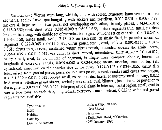 | Scientific Name Notes | According to Beveridge (1994, Keys to the cestode parasites of vertebrates, pp. 315-366), Aliezia is a synonym of Stilesia Railliet, 1893, but the combination Stilesia kaijensis (Lakhe, Patil, Shindez & Pawar, 2004) has not evidently been proposed. |
