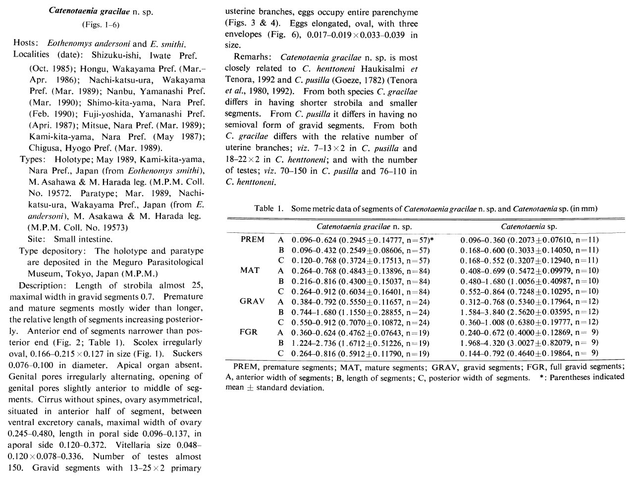 Asakawa, M., F. Tenora, M. Kamiya, M. Harada, and M. Borkovcova. 1992. Taxonomical study of the genus Catenotaenia Janicki, 1904 (Cestoda) from voles in Japan. Bulletin of the Biogeographical Society of Japan 47(7): 73-76. (5148) Download PDF |