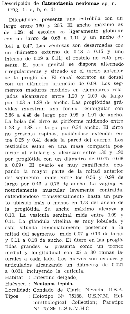 Babero, B. B and P. E. Cattan. 1983. Catenotaenia neotomae sp. n. (Cestoda: Dilepidae) parasito de Neotoma lepida (Rodentia: Cricetidae) en Nevada, U.S.A. Boletin Chileno de Parasitologia 38: 12-16.