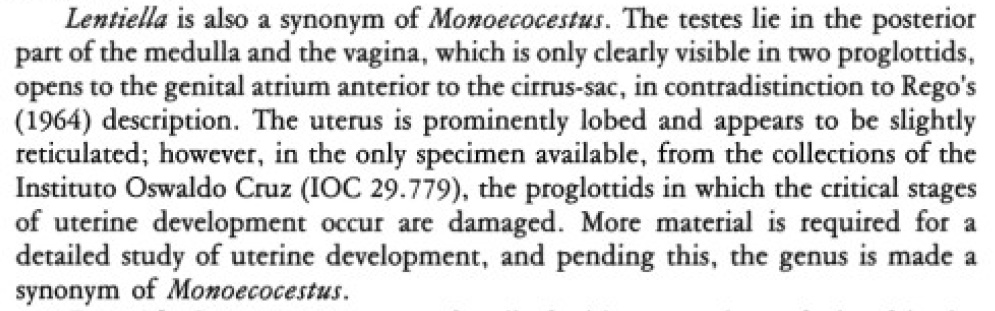 | Valid Name | Monoecocestus machadoi (Rego, 1964) Beveridge, 1994 |