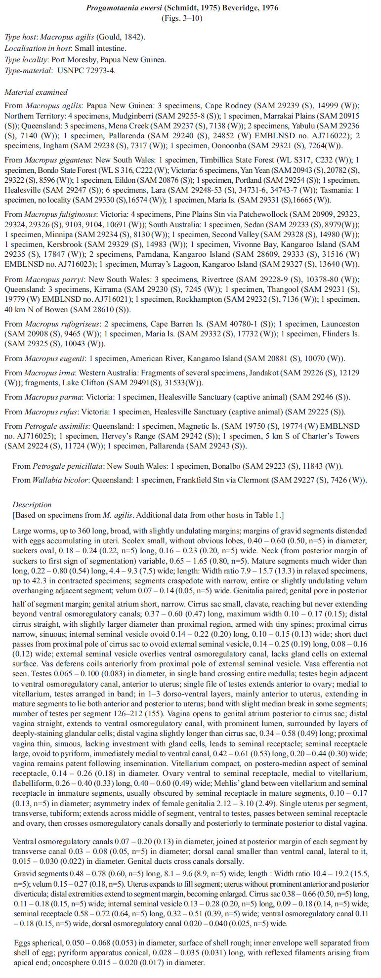 Beveridge, I. 2009. A re-description of Progamotaenia ewersi (Schmidt, 1975) (Cestoda: Anoplocephalidae) from wallabies and kangaroos (Macropodidae), with the description of a new species, P. ualabati n. sp. Transactions of the Royal Society of South Australia 133: 1-17. (4682) Download PDF |