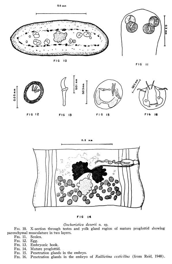 Milleman, R. E. 1955. Studies on the life-history and biology of Oochoristica deserti n. sp. (Cestoda: Linstowiidae) from desert rodents. Journal of Parasitology 41: 424-440. (5023) Download PDF |
