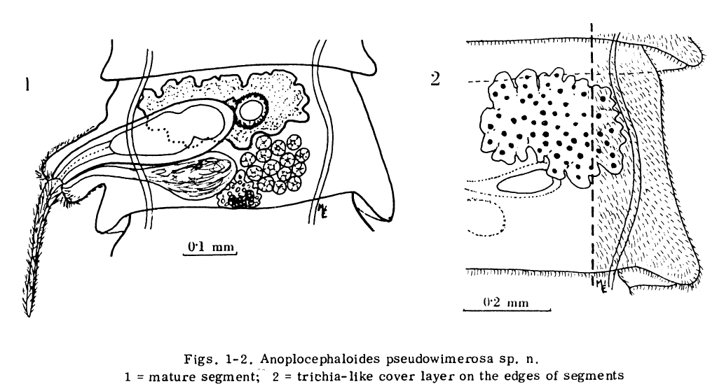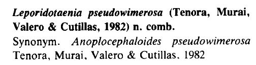 Tenora, F., E. Murai, A. Valero, and C. Cutillas. 1982. Anoplocephaloides pseudowimerosa sp. n. and other Anoplocephalidae (Cestoda) parasites of Oryctolagus cuniculus (Leporidae) in Spain. Parasitologica Hungarica 14: 73–77. (4972) Download PDFGenov, T., E. Murai, B. B. Georgiev, and E. A. Harris. 1990. The erection of Leporidotaenia n. g. (Cestoda: Anoplocephalidae) for Anoplocephaloides spp. parasitising Leporidae (Lagomorpha). Systematic Parasitology 16: 197-126. (4666) Download PDF |