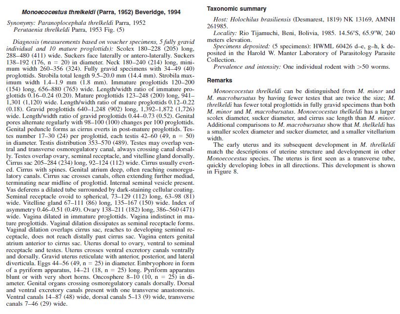 | Valid Name | Monoecocestus threlkeldi (Parra, 1952) Beveridge, 1994 |