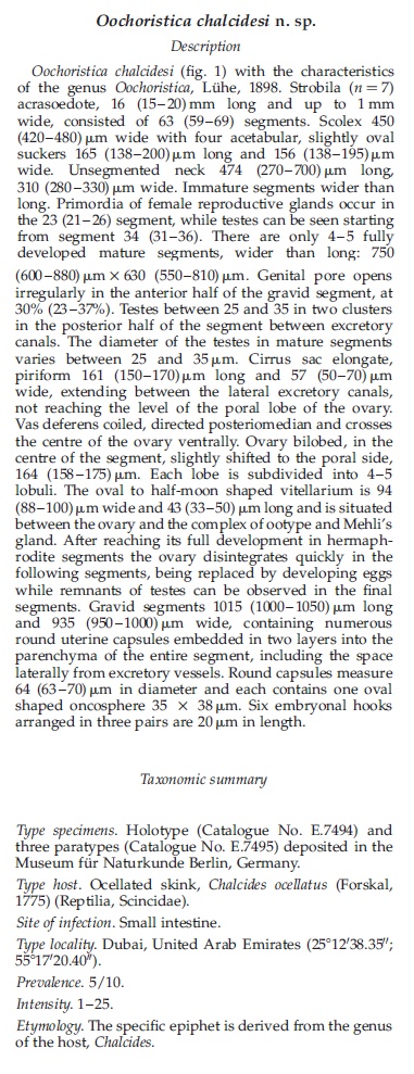 Schuster, R. K. 2011. Oochoristica chalcidesi n. sp. (Eucestoda: Linstowiidae) from the ocellated skink, Chalcides ocellatus (Forskal, 1775) in the United Arab Emirates. Journal of Helminthology 85: 468-471. (5481) Download PDF |