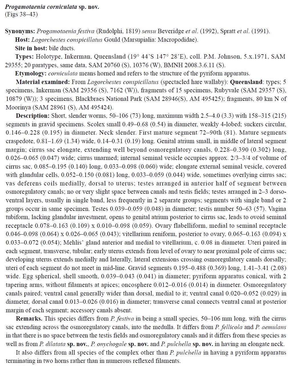 Beveridge, I. and S. Shamsi. 2009. Revision of the Progamotaenia festiva species complex (Cestoda: Anoplocephalidae) from Australasian marsupials, with the resurrection of P. fellicola (Nybelin, 1917) comb. nov. Zootaxa 1990: 1-29. (5116) Download PDF |