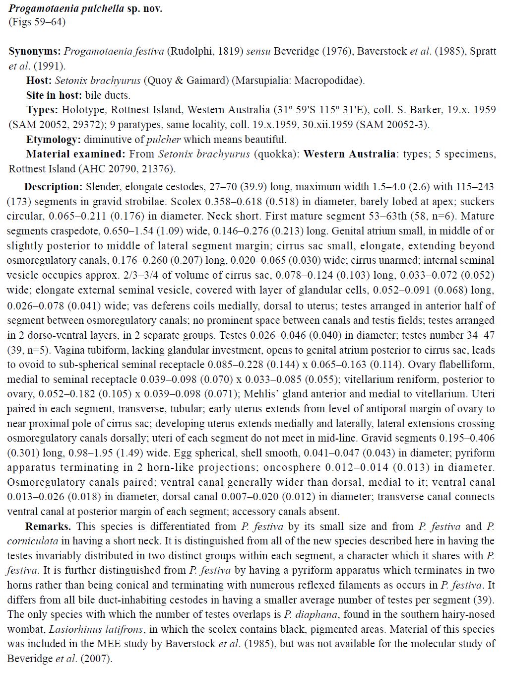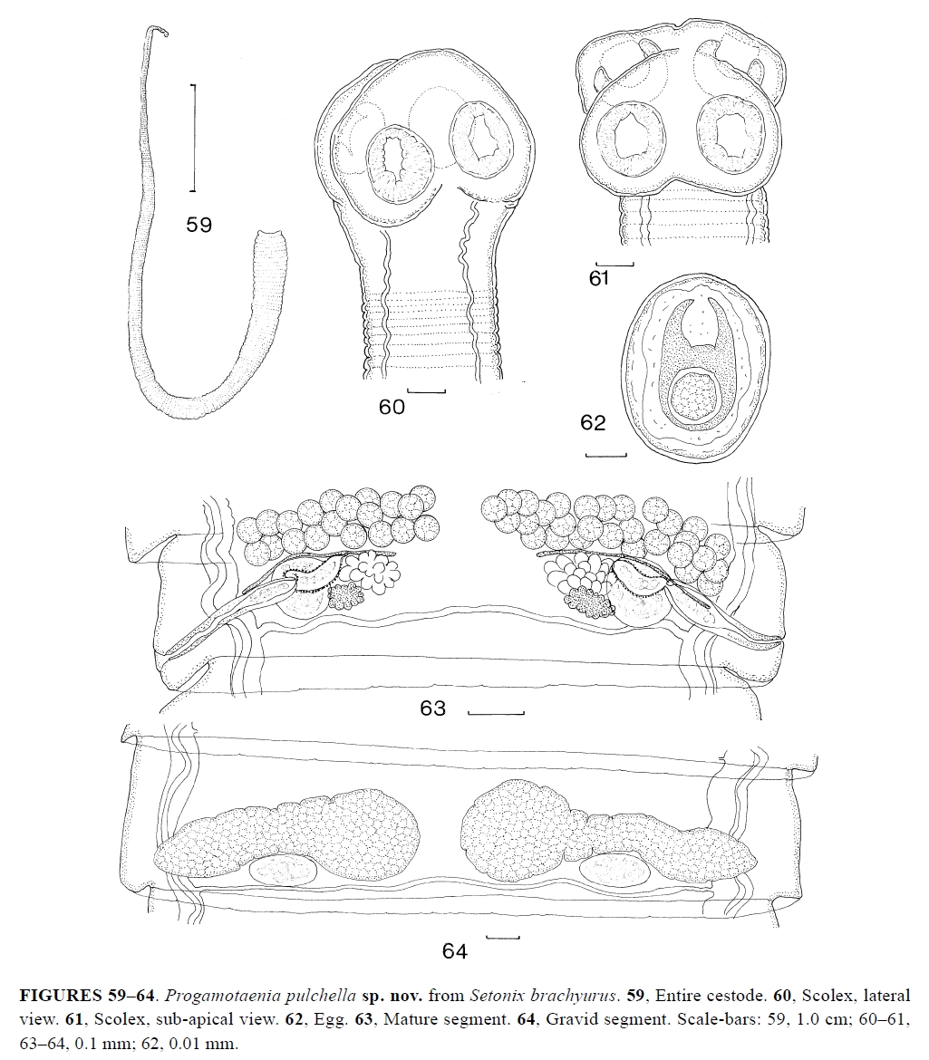 Beveridge, I. and S. Shamsi. 2009. Revision of the Progamotaenia festiva species complex (Cestoda: Anoplocephalidae) from Australasian marsupials, with the resurrection of P. fellicola (Nybelin, 1917) comb. nov. Zootaxa 1990: 1-29.