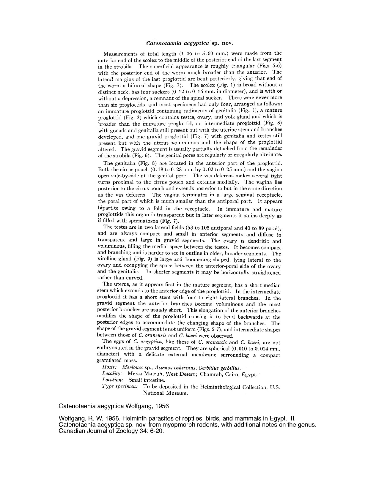 Wolfgang, R. W. 1956. Helminth parasites of reptiles, birds and mammals in Egypt. II. Catenotaenia aegyptica sp. nov. from myomorph rodents with additional notes on the genus. Canadian Journal of Zoology 34: 6-20. (5137) Download PDFTenora, F., S. Mas-Coma, E. Murai, and C. Feliu. 1980. The system of cestodes of the suborder Catenotaeniata Spassky, 1963. Parasitologica Hungarica 13: 39-57. (5138) Download PDF |