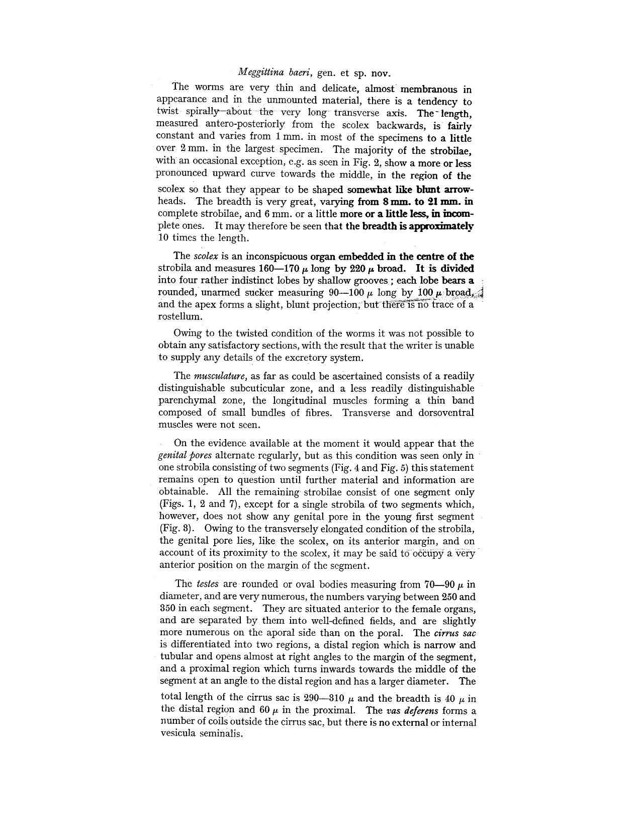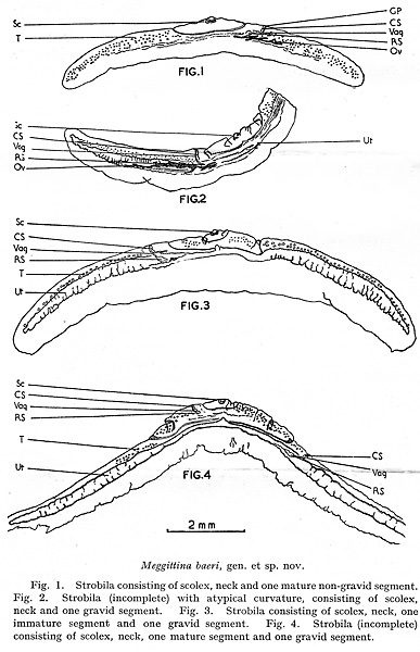 Lynsdale, J. A. 1953. On a remarkable new cestode, Meggittina baeri gen. et sp. nov. (Anoplocephalinae) from rodents in Southern Rhodesia. Journal of Helminthology 27: 129-142.