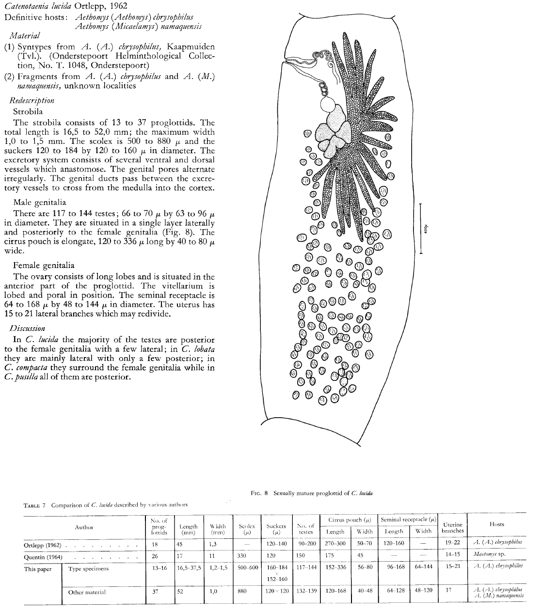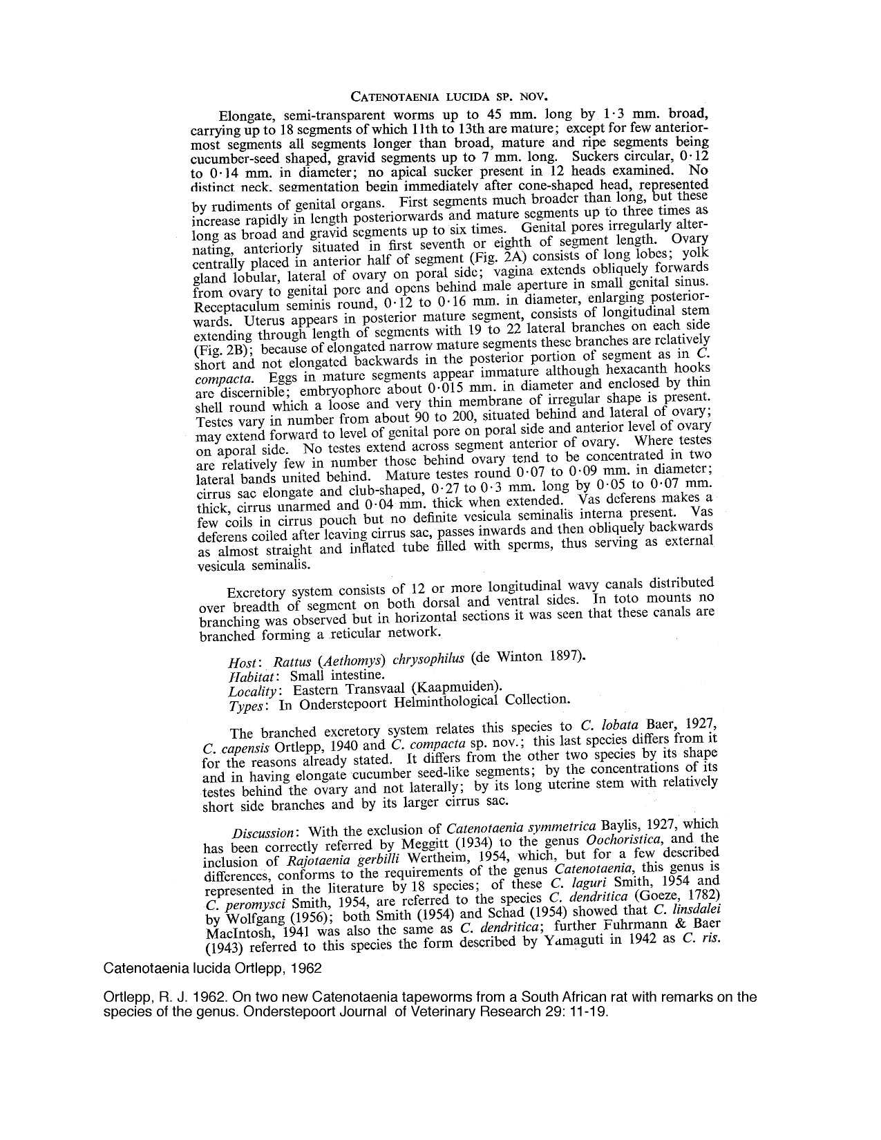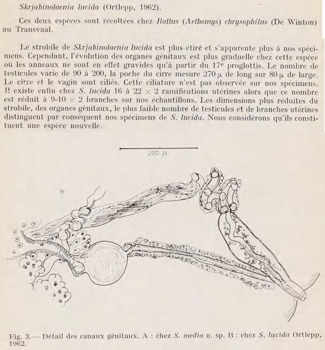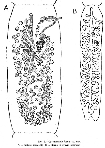 Ortlepp, R. J. 1962. On two new Catenotaenia tapeworms from a South African rat with remarks on the species of the genus. Onderstepoort Journal of Veterinary Research 29: 11-19. (5146) Download PDFQuentin, J-C. 1971. Cestodes Skrjabinotaenia de Rongeus Murides et Dendromurides de Cantrafrique. Hypothese sur l evolution des Cestodes Catenotaeniinae. Cahiers de la Maboké 9: 57-79. (5167) Download PDF |