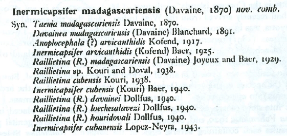 | Synonyms | Taenia madagascariensis Davaine, 1870; Davainea madagascariensis (Davaine, 1870) Blanchard, 1891; Raillietina madagascariensis (Davaine, 1870) Joyeux & Baer, 1929 |