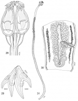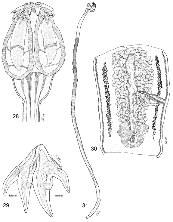 Figs 28–31. Acanthobothrium matttaylori, sp. nov. 28, Scolex. 29, Hooks. 30, Terminal proglottid. 31, Whole worm.