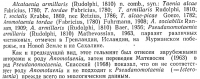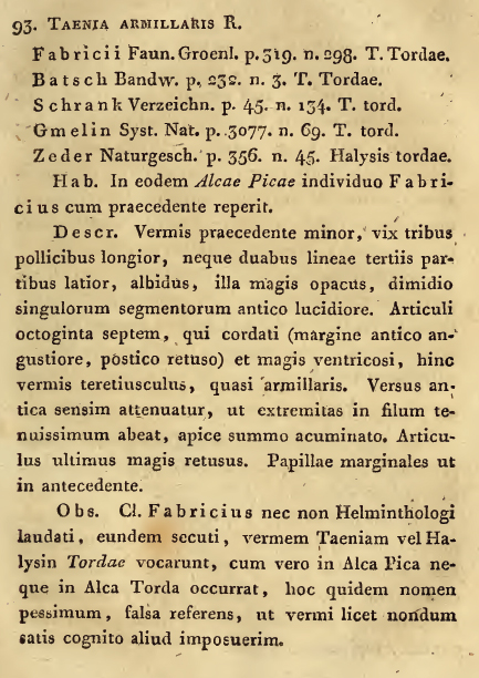 Synonyms Taenia lacae Fabricius, 1780; Taenia tordae Fabricius, 1780; Taenia armillaris Rudolphi, 1810; Taenia socialis Krabbe, 1869, nec Retzius, 1786; Taenia alcae-picae Goeze, 1782; Anomotaenia tordae (Fabricius, 1780) Fuhrmann, 1908; Anomotaenia sociabilis Ransom, 1909; Anomotaenia armillaris (Rudolphi, 1810) Baer, 1956; Pseudanomotaenia armillaris (Rudolphi, 1810) Matevosyan, 1963