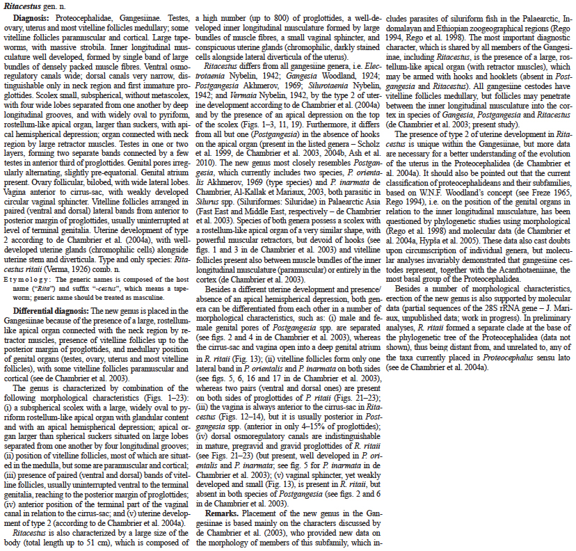 de Chambrier, A., T. Scholz, A. Ash, and P. K. Kar. 2011. Ritacestus gen. n. (Cestoda: Proteocephalidea) and redescription of R. ritaii comb. n., a parasite of Rita rita (Siluriformes) in India. Folia Parasitologica 58(4): 279-288. (5451) Download PDF |