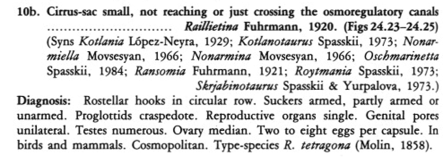 Synonyms Kotlania Lopez-Neyra, 1929; Kotlanotaurus Spasskii, 1973; Nonarmiella Movsesyan, 1966; Non armina Movsesyan, 1966; Oschmarinetta Spasskii, 1984; Ransomia Fuhrmann, 1921; Roytmania Spasskii, 1973; Skrjabinotaurus Spasskii & Yurpalova, 1973