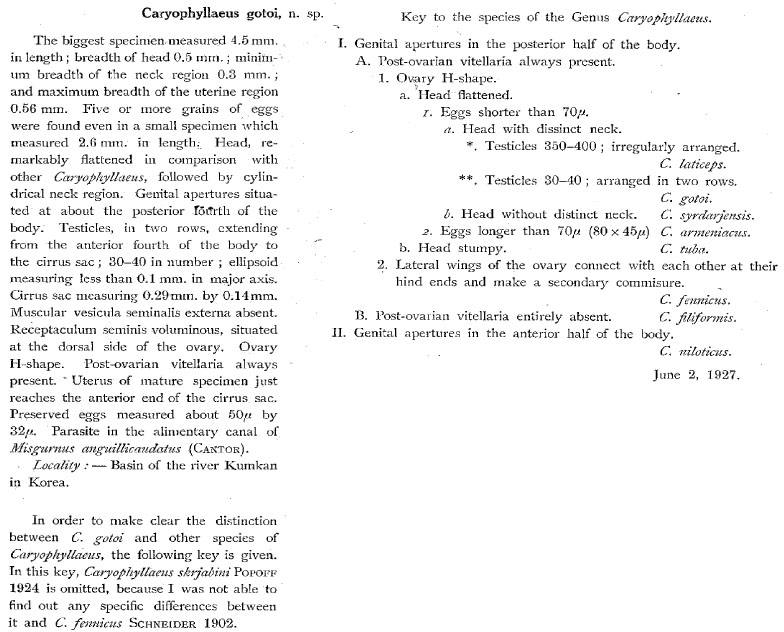 Motomura, J. 1927. On Caryophyllaeus gotoi n. sp., a new monozoic cestode from Korea. Science Reports of the Tohoku Imperial University 3(1): 51-53. (646) Download PDF |