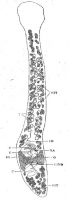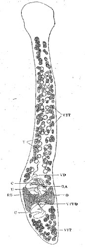 Caryophyllaeus gotoi, n. sp. C. cirrus, GA. genital apertures, O. ovary, RS. reseptaculum seminis, T. testicles, U. uterus, VD. vas deferens, VIT. vitellaria, VITD, vitelline duct.