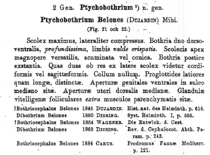 Lönnberg, E. 1889. Bidrag till kännedomen om i Sverige förekommande cestoder. Bihang till Kongliga Svanska Vetenskaps-Akademiens Handlingar 14: 1-69. (285) Download PDF |