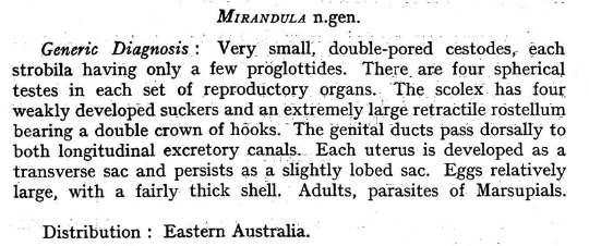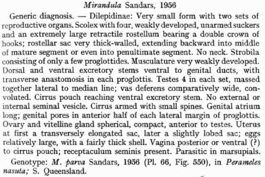 Sandars, D. F. 1956. Mirandula parva gen. et sp. nov. (Cestoda, Dilepididae) from the long-nosed Bandicoot (Perameles nasuta Geoff.). Journal of Helminthology 30: 183-188. (5485) Download PDF |