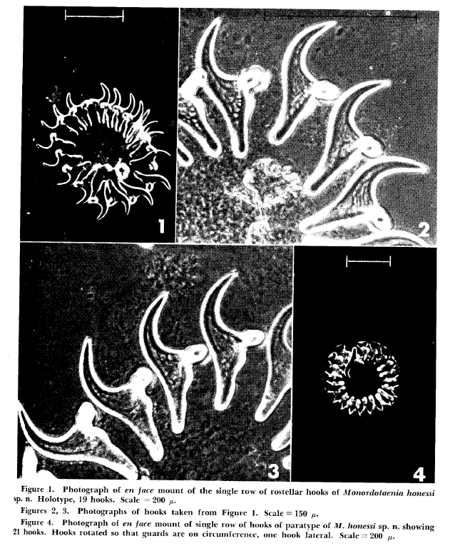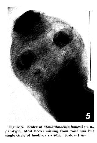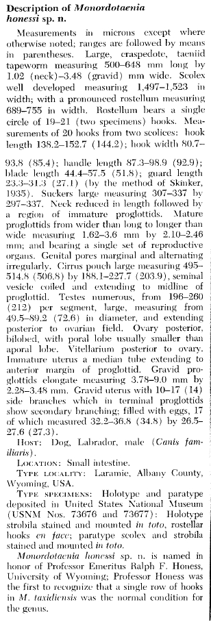 Hendrickson, G. L., R. B. Grieve, and N. Kingston. 1975. Monordotaenia honessi sp. n. (Cyclophyllidea: Taeniidae), from a dog in Wyoming: A second taeniid from North America with a single circle of hooks. Proceedings of the Helminthological Society of Washington 42(1): 46-52. (5533) Download PDF |