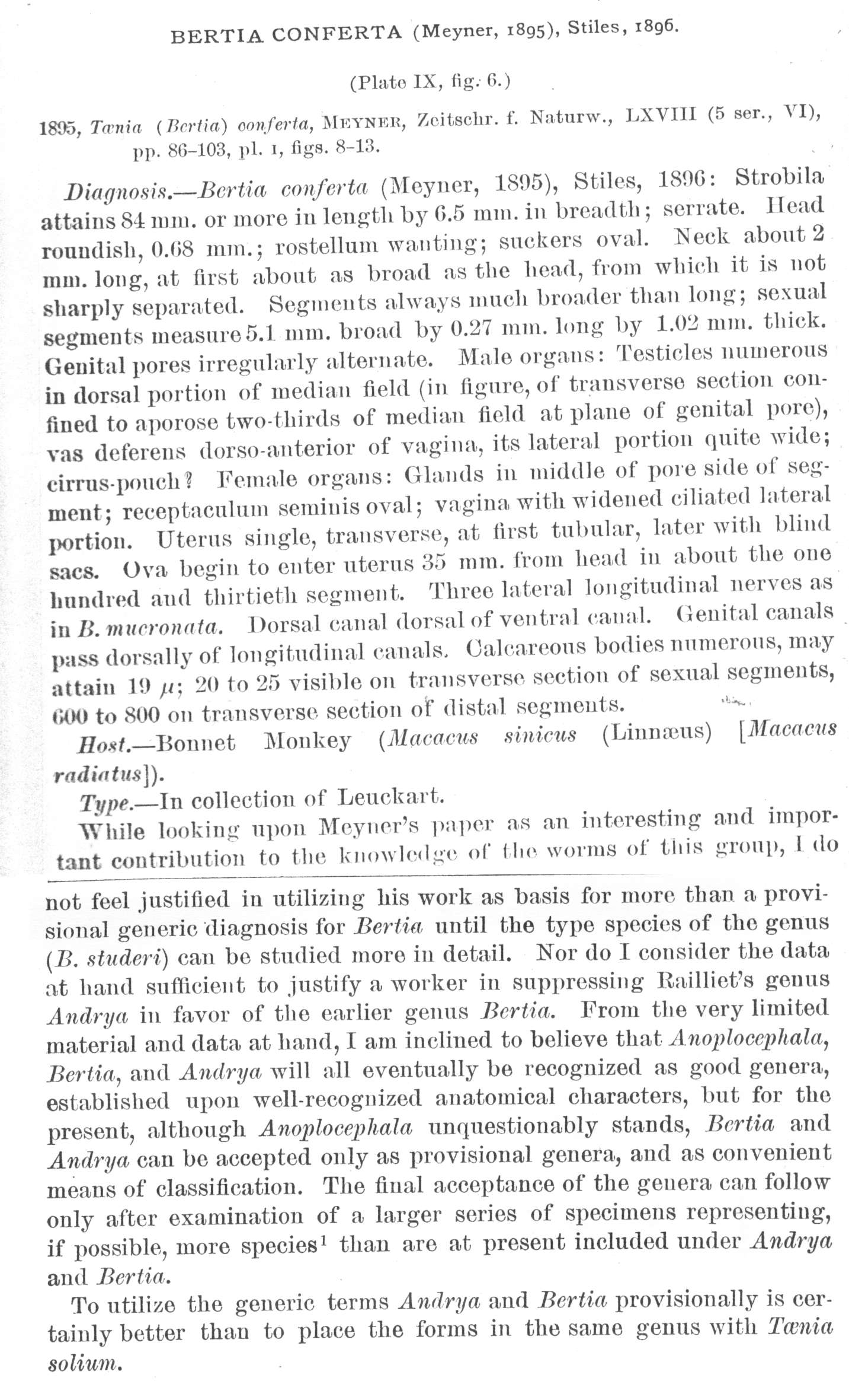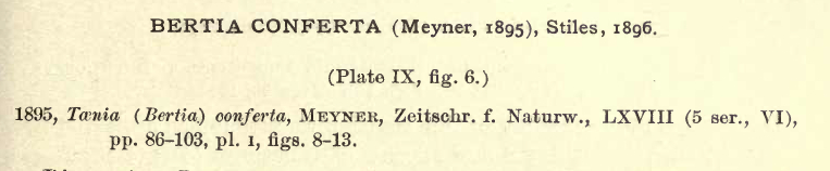 Synonyms Taenia conferta Meyner, 1895; Bertiella conferta (Meyner, 1895) Stiles & Hassall, 1902