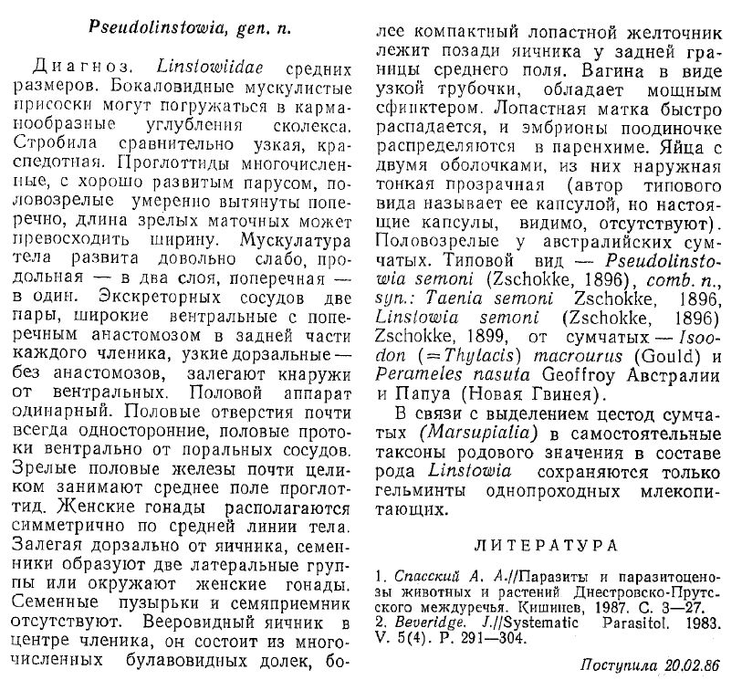 Zschokke, F. 1898. Die Cestoden der Marsupialia und Monotremata. Denkschriften der Medizinisch-Naturwissenschaftlichen Gesellschaft zu Jena 8: 357-380. (4997) Download PDFSpasskii, A. A. 1987. [A new linstowiid genus] Novyj rod linstoviid. Izvestiya Akademii Nauk Moldavskoi SSR, Biologicheskikh I Khimicheskikh Nauk 5: 35-37. (5630) Download PDF |