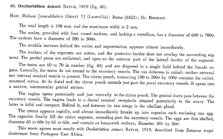 Baylis, H. A. 1919. On two new species of the cestode genus Oochoristica from lizards. Parasitology 11: 405-414. (5180) Download PDFSpasskii, A. A. 1988. [New genus of skrjabinochorid (Cestoda: Cyclophyllidea)] Novyj rod skrjabinohorid (Cestoda: Cyclophyllidea). Izvestiya Akademii Nauk Moldavskoi SSR Seriya Biologicheskikh i Khimicheskikh Nauk 5: 42-44. (5631) Download PDF |