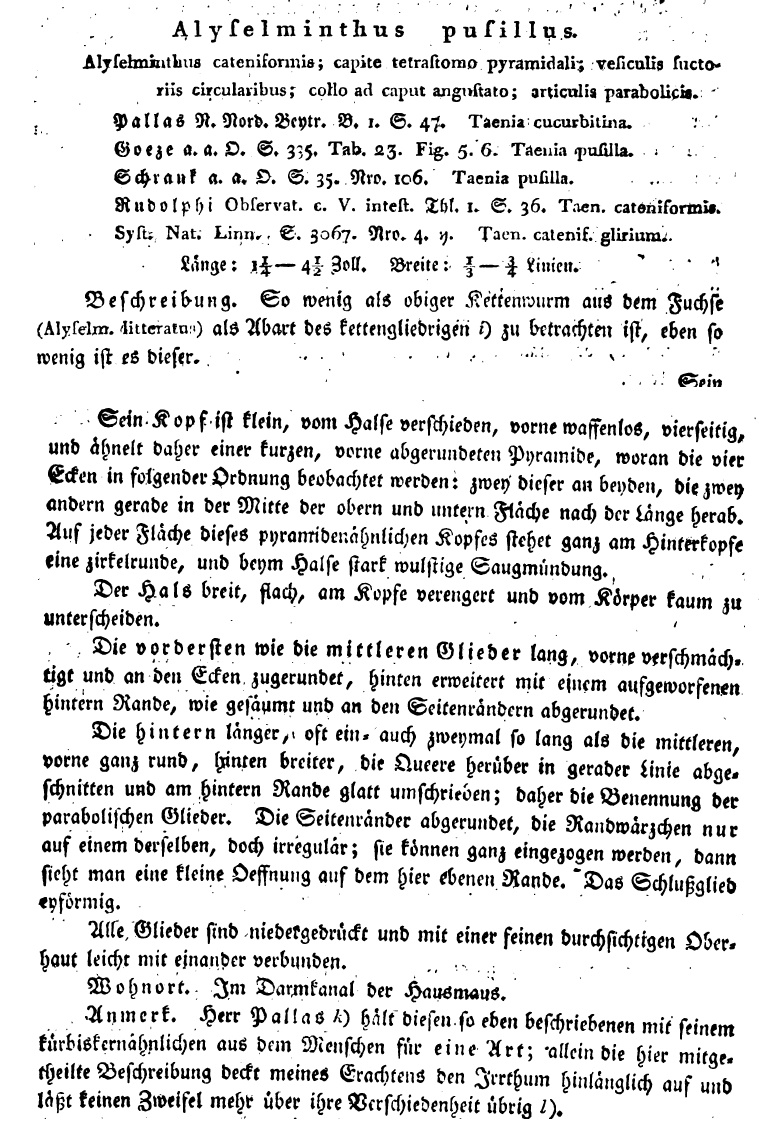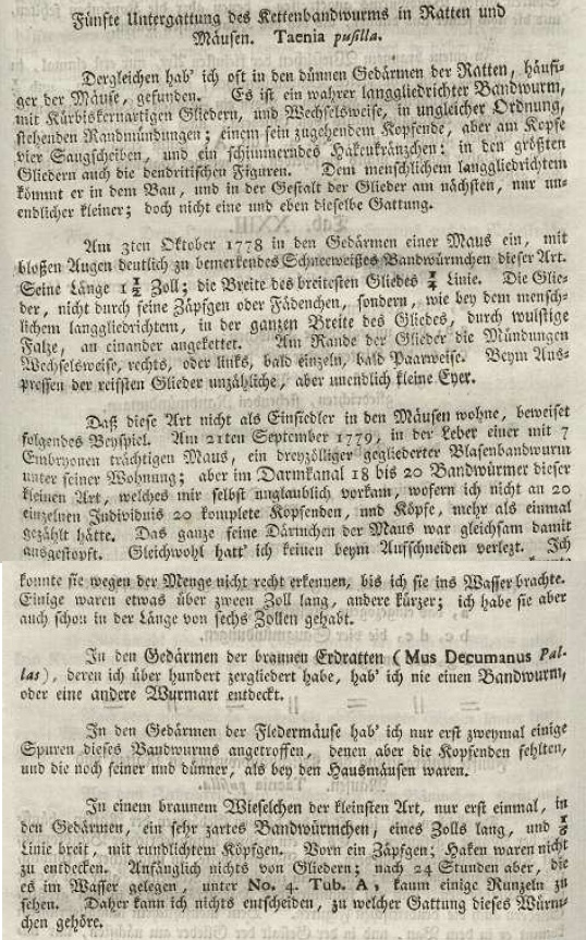 Goeze, J. A. E. 1782. Versuch einer Naturgeschichte der Eingeweidewürmer thierischer Körper. Gedruckt bey Philipp Adam Pape, Blankenburg, 471 pp & 44 plat pp. (4166) Download PDFZeder, J. G. H. 1800. Erster Nachtrag zur Naturgeschichte der Eingeweidewürmer von Johann August Ephraim Goeze. Crusius, Leipzig, 320 + 6 Kupferta pp. (712) Download PDF |