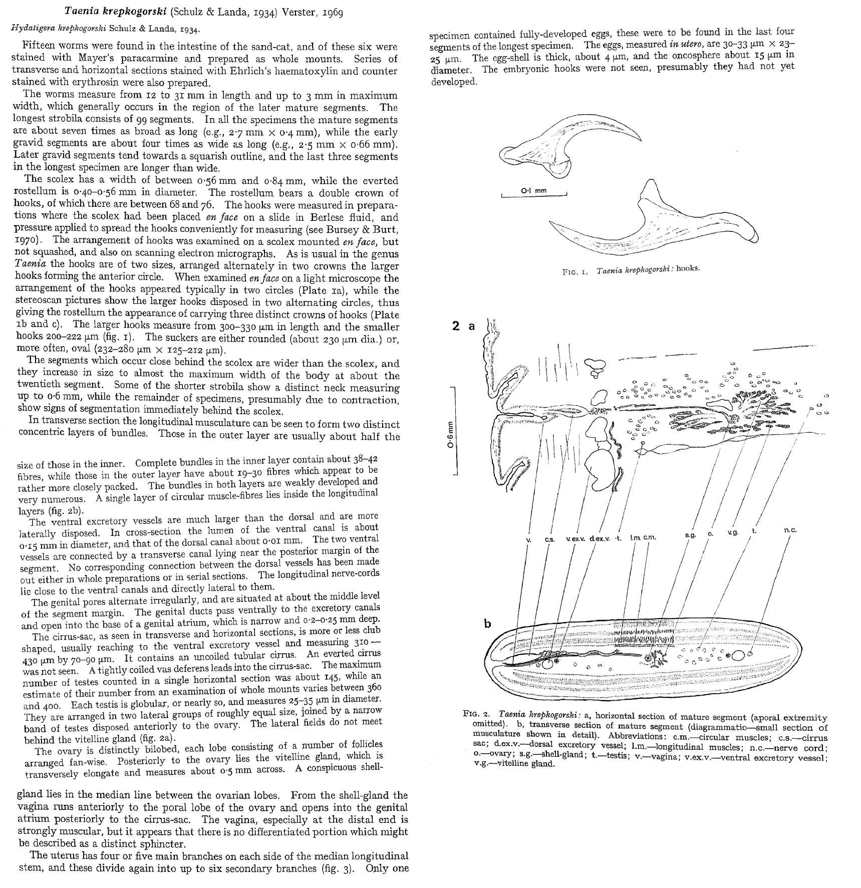 Verster, A. 1969. A taxonomic revision of the genus Taenia Linnaeus, 1758 s. str. Onderstepoort Journal of Veterinary Research 36: 3-58.