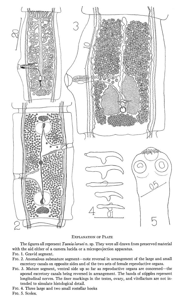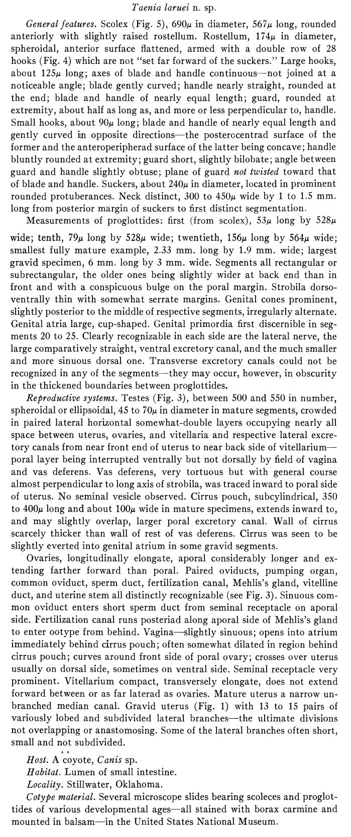 | Type Material | Cotype material. Several microscope slides bearing scoleces and proglottides of various developmental ages-all stained with borax carmine and mounted in balsam-in the United States National Museum. |