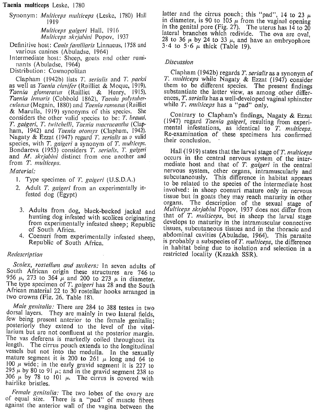 Leske, N. G. 1780. Von dem Drehen der Schafe und dem Blasenwurme im Gehirne derselben als die Ursache dieser Krankheit. , Leipzig, 53 pp. (7296)Hall, M. C. 1919 (1920). The adult taenioid cestodes of dogs and cats, and of related carnivores in North America. Proceedings of the United States National Museum 55: 1-94. (6500) Download PDF |