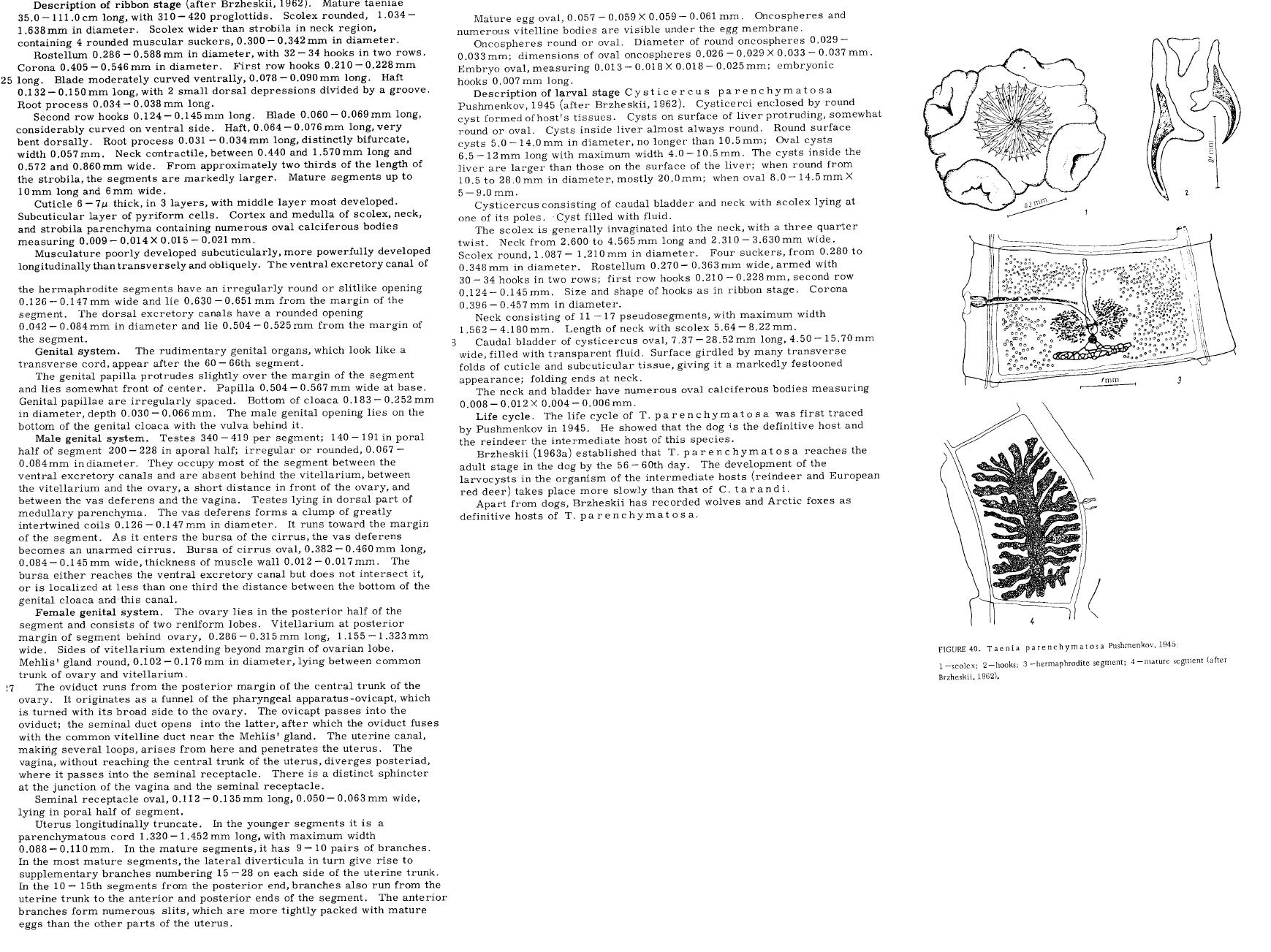 | Host Notes | Experimental definitive host the dog (Canis lupus familiaris; Pushmenkov, 1945). Natural definitive hosts the Artic fox Vulpes lagopus and the wolf Canis lupus (Brzheskii, 1962). |