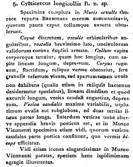 Rudolphi, C. A. 1819. Entozoorum synopsis, cui accedunt mantissa duplex et indices locupletissimi. Sumtibus Augusti Rücker, Berolini (Berlin), 811 pp. (14) Download PDF |