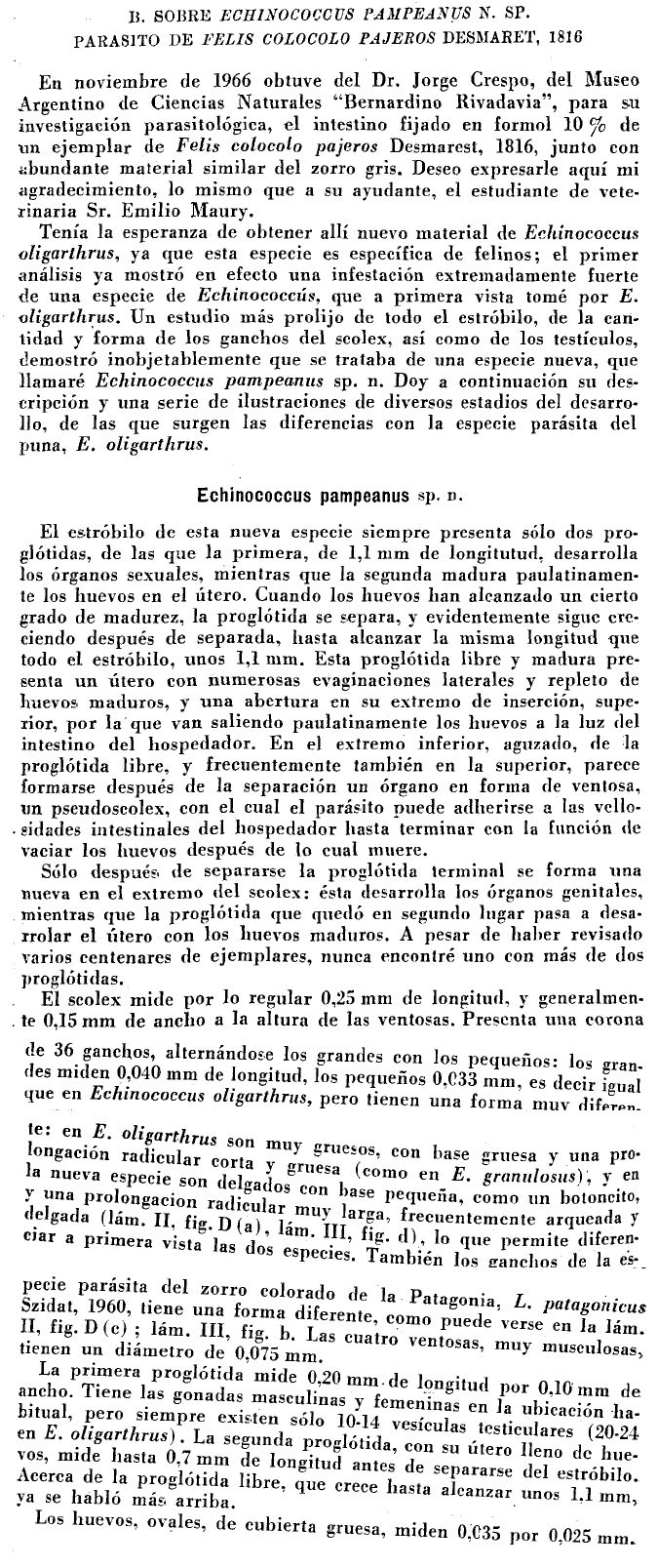 Szidat, L. 1967. Echinococcus pampeanus una nueva especie de la Argentina, parasita de Felis colocolo pajeros Desmarest, 1916 (Cestoda). Neotropica 13: 90-96. (5791) Download PDF |