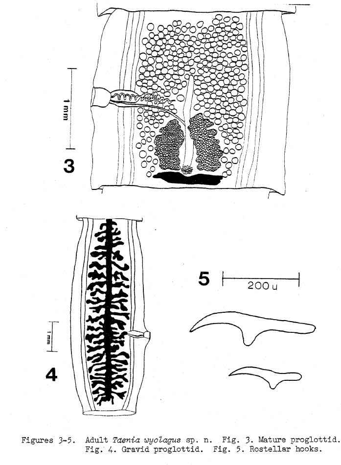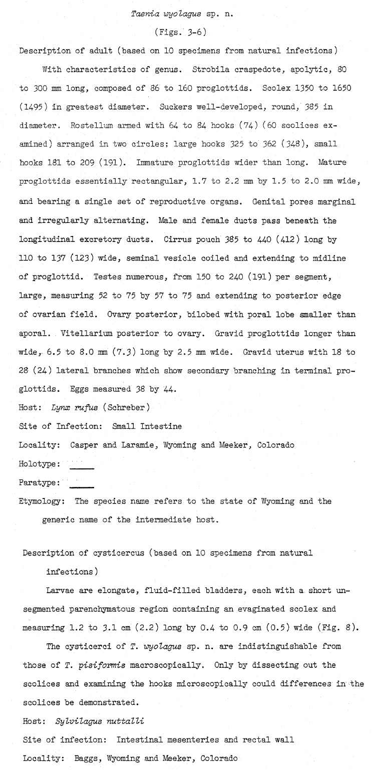 Shults, L. M. 1982. Taenia wyolagus sp. n. (Cestoda: Taeniidae) from bobcats (Lynx rufus) and cottontail rabbits (Sylvilagus nuttalli): description, life history, and distribution, University of Wyoming, Laramie, 36 pp. (5836) Download PDF |
