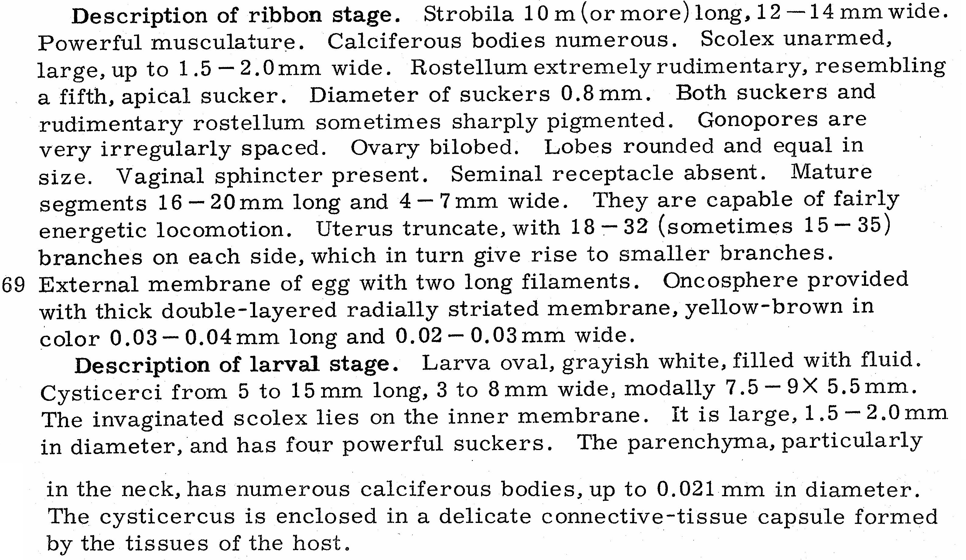 | Scientific Name Notes | Additonal synonyms according to Verster (1967): Taenia confusa Ward, 1896, Taenia africana Linstow, 1900, Taenia hominis Linstow, 1904, Taenia tonkinensis Railliet & Henry, 1905, Taenia philippina Garrison, 1907, Taenia bremneri Stephens, 1908. Taenia cylindrica Leon, 1922 (for additional older synonyms see Abuladze 1964). |