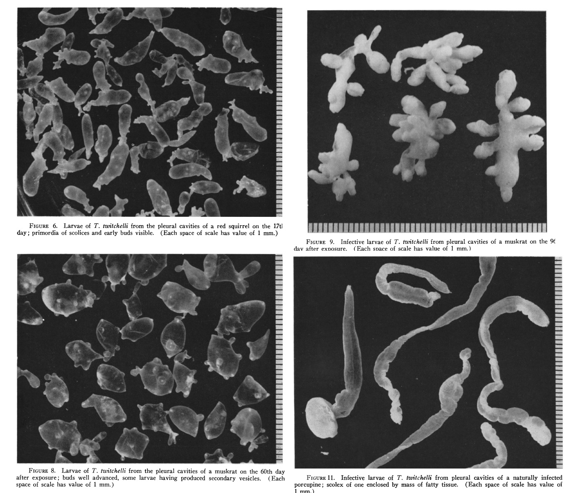 Schwartz, B. 1924. A new proliferating larval tapeworm from a porcupine. Proceedings of the United States National Museum 66: 1-14. (5777) Download PDFKornyushin, V. V. and L. D. Sharpilo. 1986. [A new taeniid genus (Cestoda, Taeniidae) - parasites of mustelids] (in Russian) Novyj rod teniid (Cestoda, Taeniidae) - parasitov kunih. Vestnik Zoologii 1986: 10-16. (5728) Download PDF |